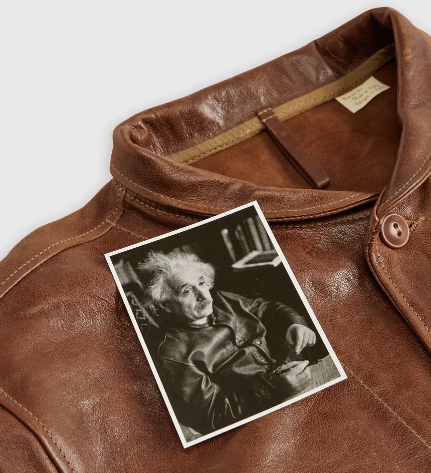 그로부터 2년 뒤, 리바이스 빈티지 클로딩(LVC) 라인은 이 경매품을 정밀하게 분석해 ‘아인슈타인 재킷’이라는 이름으로 리이슈합니다. 원본처럼 코사크 형태와 실루엣은 그대로 두되, 카우하이드 대신 이탈리아산 양가죽을 사용해 500벌 한정으로 제작했죠. 이후에는 브라운이 아닌 블랙 레더 버전으로 변주해 다시 선보였고, 올해에는 풀 그레인 양가죽을 사용한 버전으로 또 한 번 재출시했습니다.