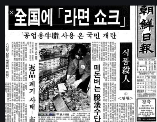 지금 시판되는 대부분의 라면은 야자나무 열매에서 짜낸 팜유로 튀기지만, 1960년대 한국은 식용유지를 전량 수입에 의존하던 시기였고, 팜유 생산량도 충분하지 않았습니다. 맛과 생산을 모두 확보하기 위해선 우지가 더 현실적인 선택지였죠. 1989년, 삼양을 비롯한 여러 식품 회사가 공업용 우지를 사용했다는 의혹에 휩싸이기 전까지는요. 1997년 무죄 판결을 받긴 했으나, 삼양라면은 시장에서 한참 뒤로 밀려납니다.