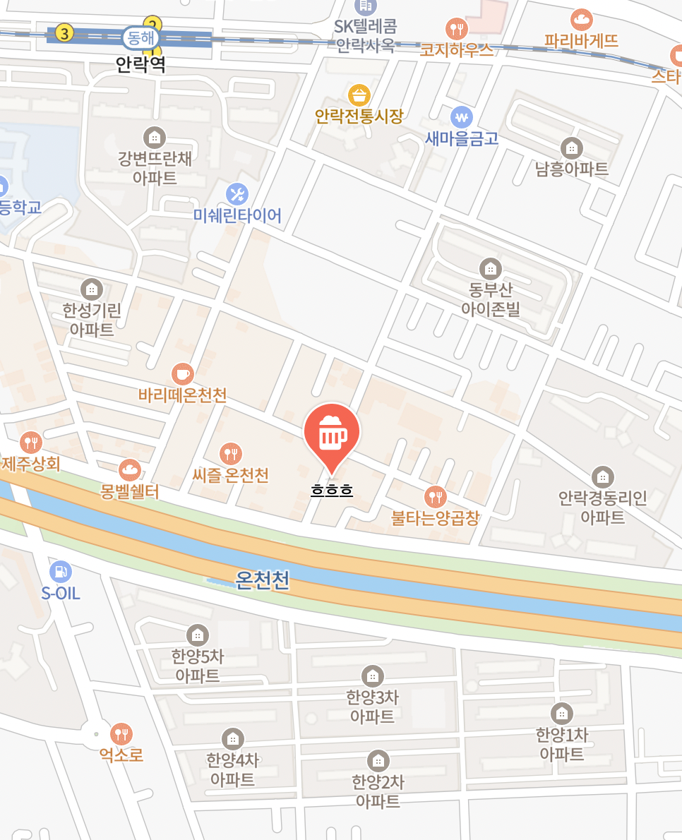 마지막으로 소개할 곳은 안락동에 위치한 'ㅎㅎㅎ(흐흐흐)'입니다. 오시게와 마찬가지로 온천천을 곁에 두고 자리한 이곳은, 자체 양조 맥주는 물론 다른 양조장과의 협업으로 탄생한 시즈널 맥주, 그리고 국내외 다양한 수제 맥주를 한자리에서 경험할 수 있는 탭룸 스타일로 운영되고 있습니다.