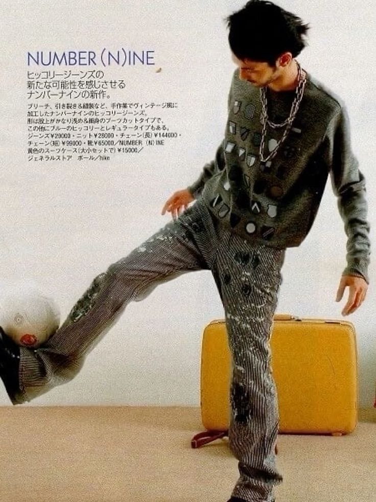 초창기 넘버나인은 그래픽 티셔츠 같은 비교적 가벼운 제품군에서 시작해, 빈티지 피스를 재해석하고 비틀어 만든 아이템으로 팬층을 넓혀갔습니다. 특히 해진 부분이나 수선의 흔적을 감추지 않고 드러내는 방식은, 80년대 가와쿠보 레이와 요지 야마모토로 대표되는 해체적 미감의 계보를 스트릿 감각으로 다시 번역한 결과처럼 보이기도 합니다. 다만 넘버나인의 특이점은 ‘허름함’을 단순히 방치하는 대신, 그 허름함을 정교하게 설계하여 컬트적인 설득력을 만들어냈다는 데 있었습니다.