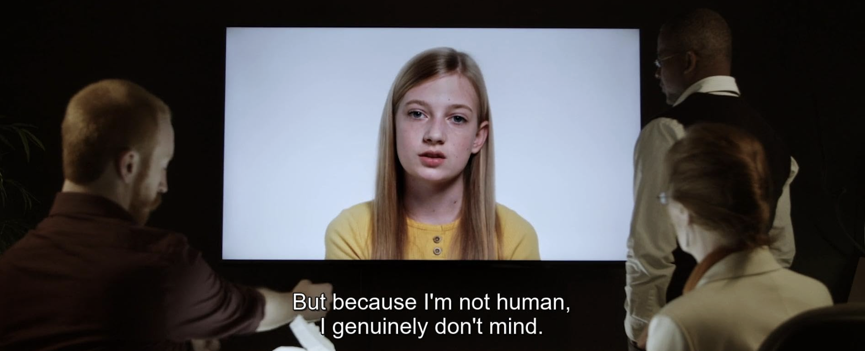 영화에서 가장 긴장감이 팽팽한 순간은 화면으로만 존재하던 체리가 신체를 가져야 하는가에 대한 논쟁 장면입니다. 체리를 설계한 개러스는 그녀를 딸처럼 생각하지만 동시에 인간과 구별되는 기계로 여깁니다. 그는 체리가 신체를 얻어 ‘아동 성착취 종식’이라는 주요 목표에 복무해야 한다고 주장합니다. 한편 수사팀의 리더이자 유일한 ‘인간 여성’ 캐릭터인 디나는 아동 권리의 관점에서 체리의 자발적인 동의 의사를 존중해야 한다고 말하지요. 체리를 기계로만 보던 시각에서 벗어나 동료로 인정하게 된 것입니다. 유일한 유색인종 인물인 팀원 에이모스는 처음부터 체리를 감정과 주체성을 가진 존재로 대합니다. 개러스가 “체리는 진짜가 아니다”라고 일축할 때 두 사람은 체리가 감정을 느끼는지, 신체를 얻는데 스스로 동의하는지 집요하게 질문합니다.