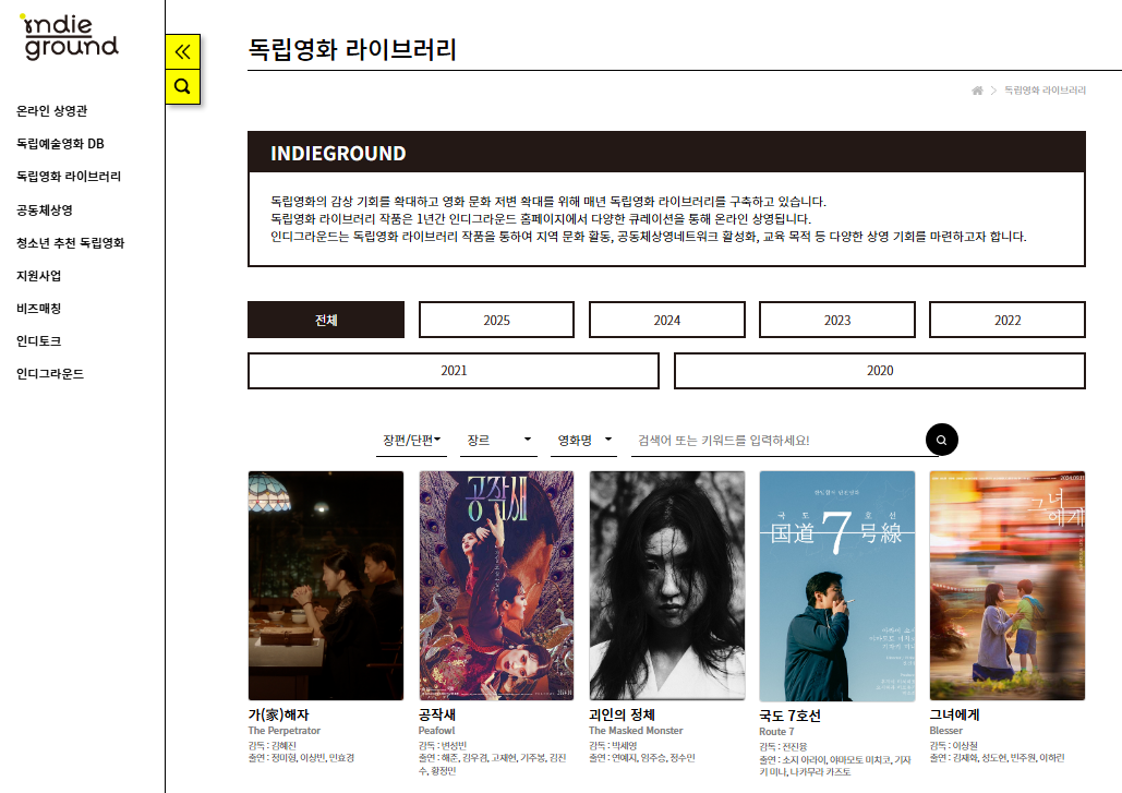 인디 그라운드는 한국의 독립·예술 영화와 영화 관련 자료들을 자체적인 온라인 플랫폼을 통해 제공하고 있습니다. 언제 어디서든 방문이 가능한 한국 독립영화 아카이브 공간인데요. 일단 홈페이지를 방문하면 ‘독립예술영화 DB’ 카테고리를 통해 한국의 독립·예술 영화 리스트는 물론, 신작 개봉 소식까지 파악할 수 있습니다. 검색하면 한눈에 영화 정보가 뜨는 상업 영화에 비해 인지도가 낮은 독립·예술 영화는 정보가 흩어져 있다고 느끼게 되는데요. 이때 인디 그라운드를 통하면 영화의 시놉시스부터 수상 내역까지 관련 정보를 한눈에 볼 수 있다는 장점이 있습니다.