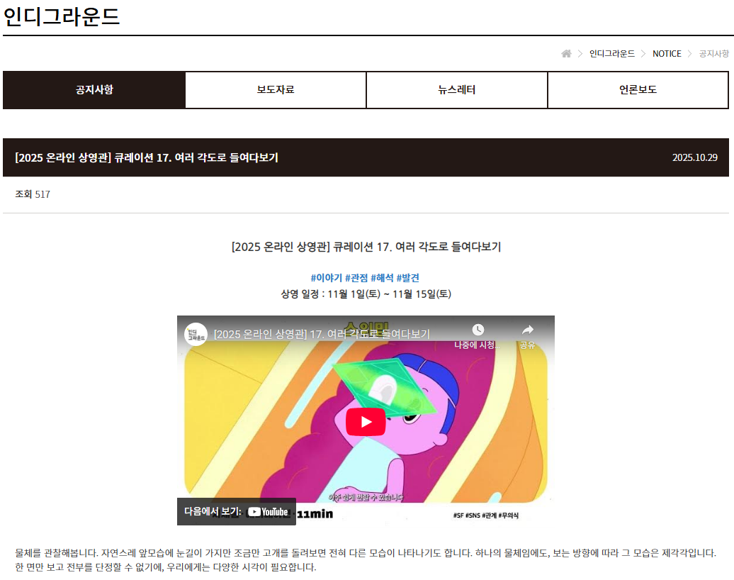 가장 유용하게 이용하는 인디그라운드 콘텐츠로는 ‘독립영화 라이브러리’와 ‘온라인 상영관’을 소개하려고 합니다. 인디 그라운드에서는 독립영화 감상 기회의 확대를 위해 매년 독립영화 라이브러리를 구축하고 있습니다. 매년 공모를 통해 접수된 독립·예술 영화 작품 중, 심사를 통해 선정된 작품은 독립영화 라이브러리에 기록되며 온라인 상영관에서 정기적인 큐레이션을 통해 관객들에게 스트리밍됩니다. 오늘날의 주목할 만한 한국 독립 영화들을 한자리에서 꾸준히 만날 수 있는 기회이니, 한국 독립영화를 사랑하는 이들이라면 꼭 눈여겨보시길 바랍니다. 상영이 끝난 큐레이션이어도 ‘추천 큐레이션’ 리스트를 통해 기록을 확인해 볼 수 있으니 흥미로운 주제를 바탕으로 한 새로운 한국 독립·예술 영화들을 둘러보고 싶을 때 접속해 보길 추천합니다.