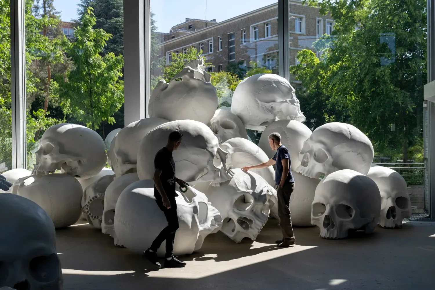 두개골 각각의 모양과 서로 겹치고 부딪히는 모습을 관찰했습니다. 나아가 미술관 공간과의 조화도 바라보았습니다. 인상 깊은 모습에 다른 전시에서는 <매스>를 어떻게 배치했는지 찾아보니, 사뭇 다른 광경이었습니다. 서울 전시에서 작은 공간에 두개골을 높다랗게 쌓아 올렸다면, 파리에서는 유리창으로 둘러싸인 공간에 두개골을 곳곳에 배치해 관람객이 그 사이를 걸을 수 있도록 했습니다. 빛이 가득 들어오는 그곳에서 두개골 사이를 걸으면 전혀 다른 인상과 느낌을 받았을 거란 예감이 들었습니다.