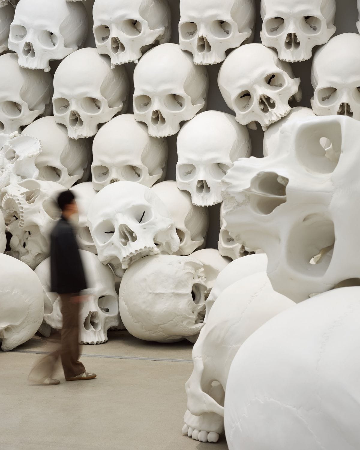 론 뮤익 전시를 다녀온 사람이라면 잊지 못할 광경이 있습니다. 미술관의 높은 천장까지 100개의 거대한 두개골 형상이 끝없이 쌓여 있는 작품 <매스(Mass)>입니다. 다양한 작품이 배치된 큰 전시장을 지나서, 독립된 공간에 두개골만 가득한 모습이 충격적이었죠.