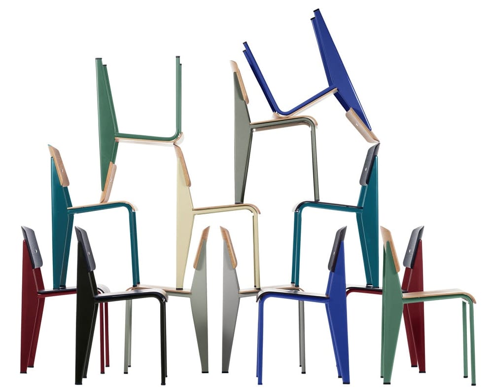파괴된 생활 인프라를 복구하려면 공공시설을 빠르게 다시 짓는 일도 무척 중요했는데요. 여기, 이번에는 학교, 도서관, 사무실 등 대량의 의자가 필요한 공간을 위해 만들어진 의자가 있습니다. 장 프루베(Jean Prouvé)가 디자인한 스탠다드 체어(Standard Chair)입니다. 스탠다드라는 이름에서 표준 디자인을 세우겠다는 단호한 선언을 느낄 수 있는데요. 1934년에 제작된 프루베 공방의 4번 의자(Chair No.4)를 모델로 발전해온 디자인입니다. 형태를 살펴보면 익숙한 학교 의자의 모습이 떠올라요. 스탠다드 체어가 지금까지 교육기관을 비롯해 여러 장소에서 사용되는 의자들의 원형을 제공한 셈입니다.