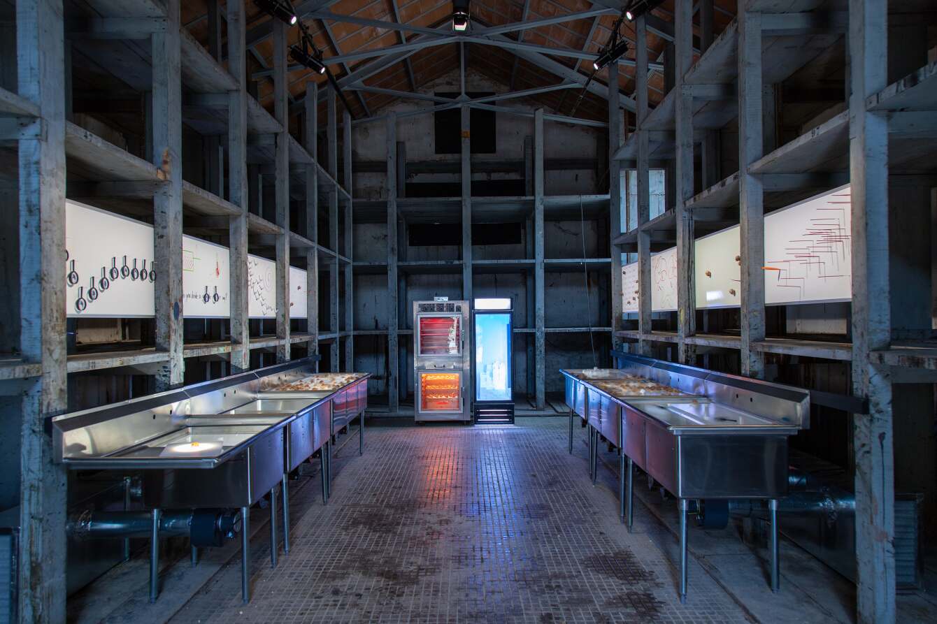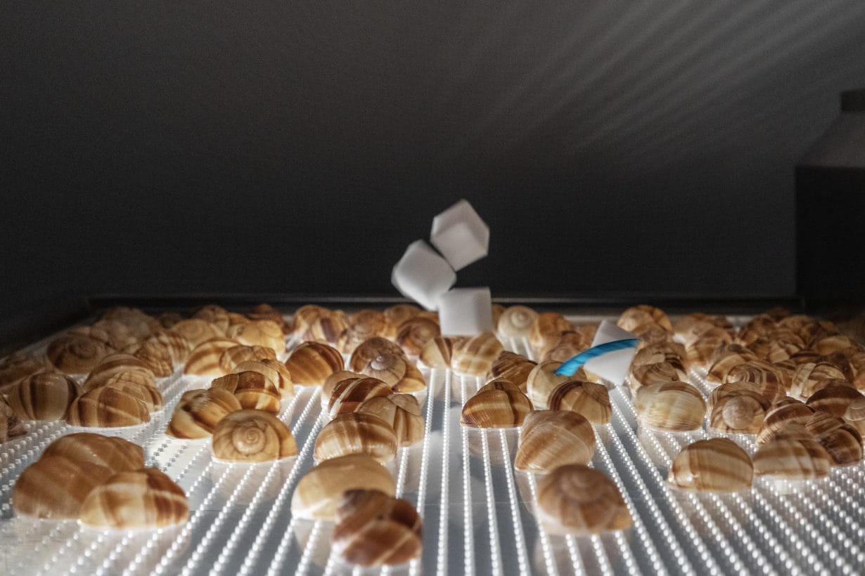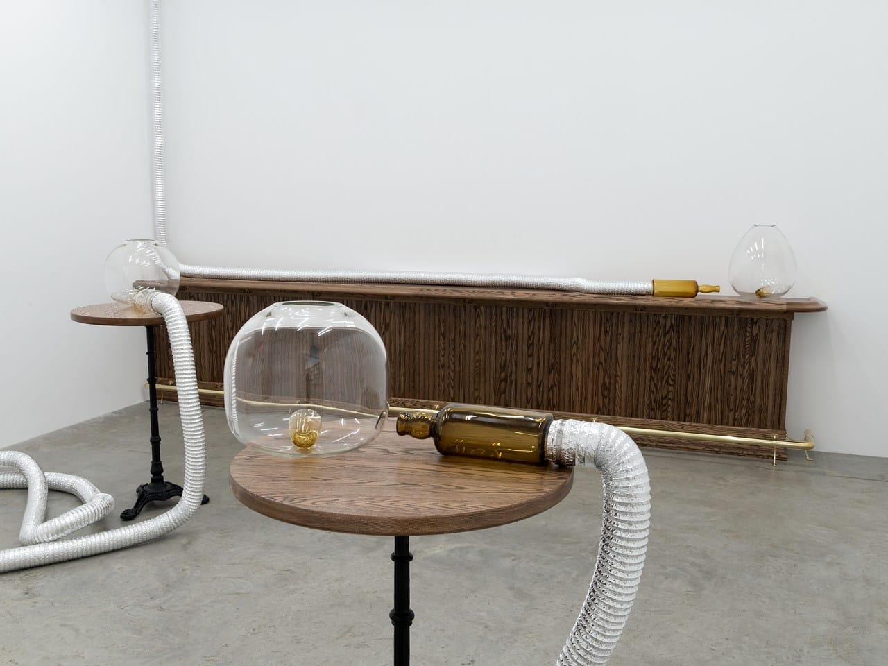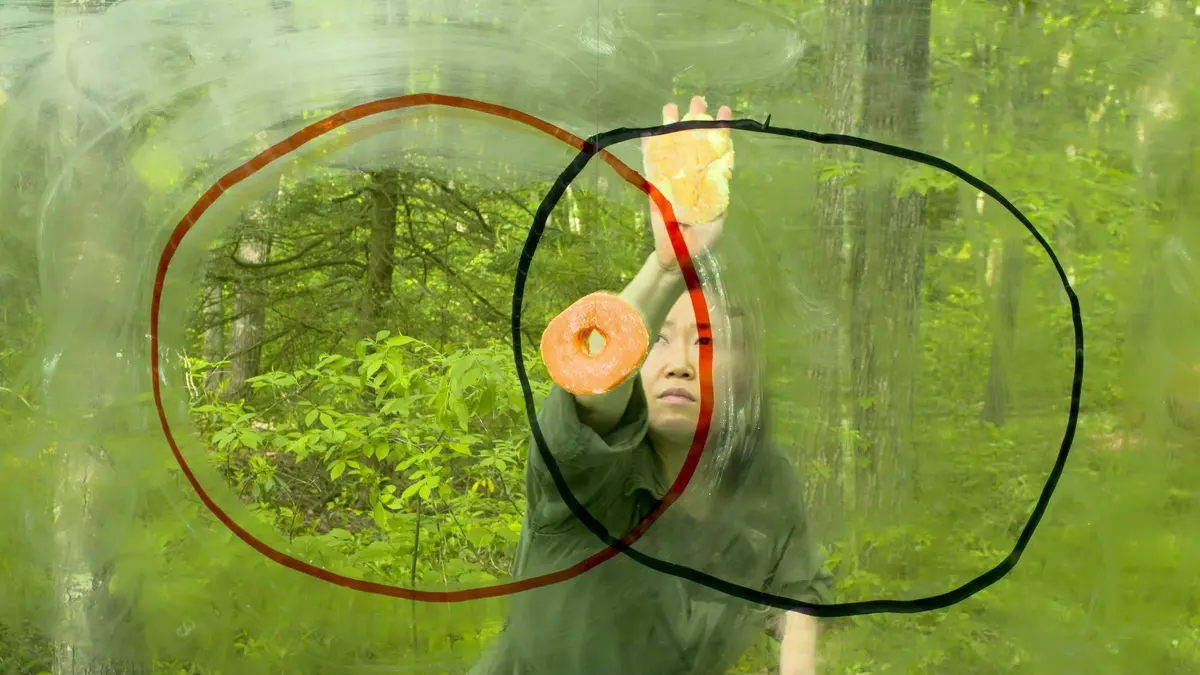 픽션 다큐멘터리 <An Artist Walks into a Bar>는 이러한 감각의 변화를 실제 작품으로 전환해 가는 과정을 보여줍니다. 바텐더가 먹던 도넛은 숲 한가운데에서 관객과 작품 사이의 경계를 허무는 매개가 되었고(<Do Nut Diagram>), 유리잔은 특수 제작된 커다란 유리공 안에서 공기에 의해 끊임없이 구르며 소리를 냅니다(<Past in a future tense>). 바텐더와의 대화는 관객을 참여시키는 퍼포먼스로 이어졌죠(<Wrong Happy Hour>).