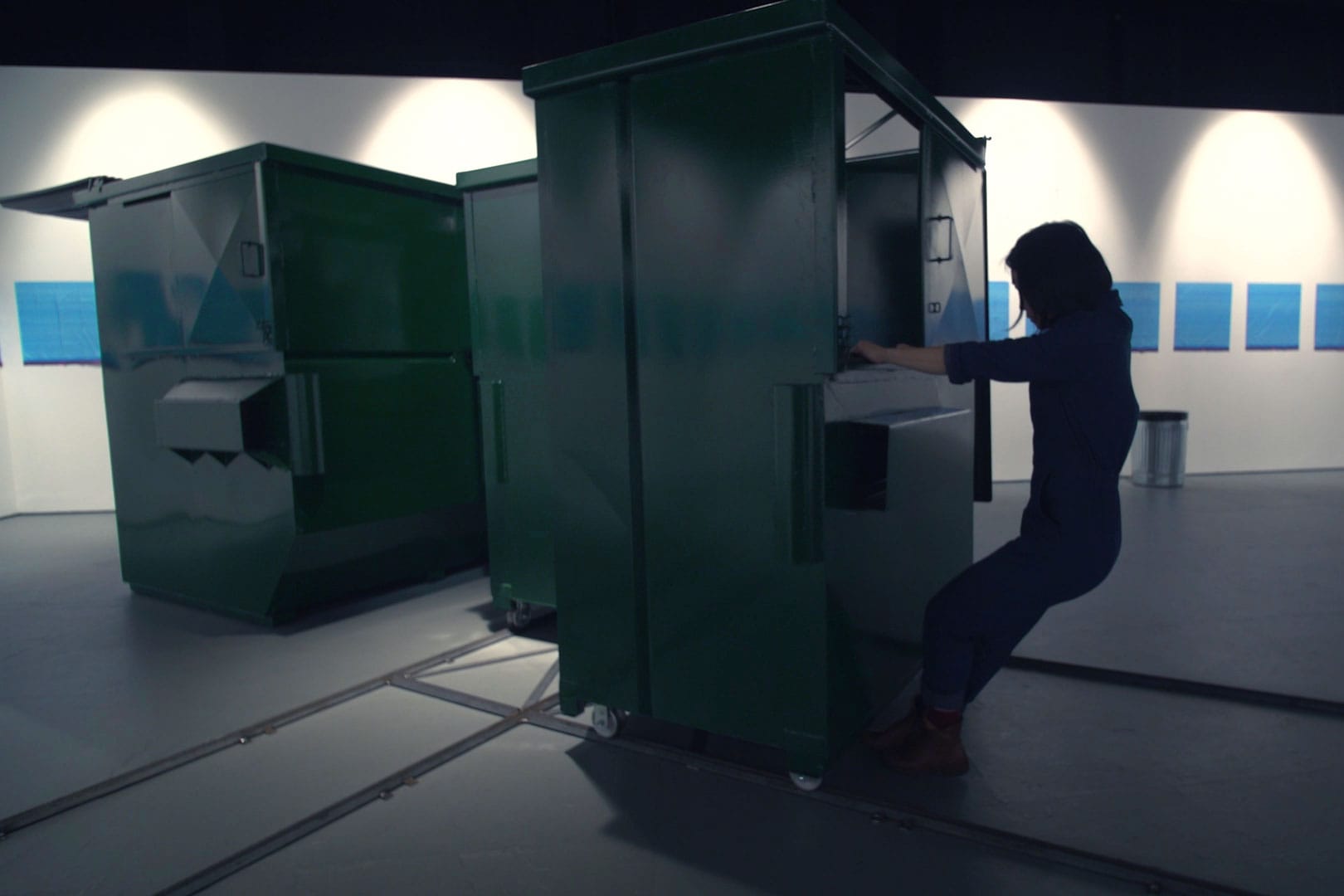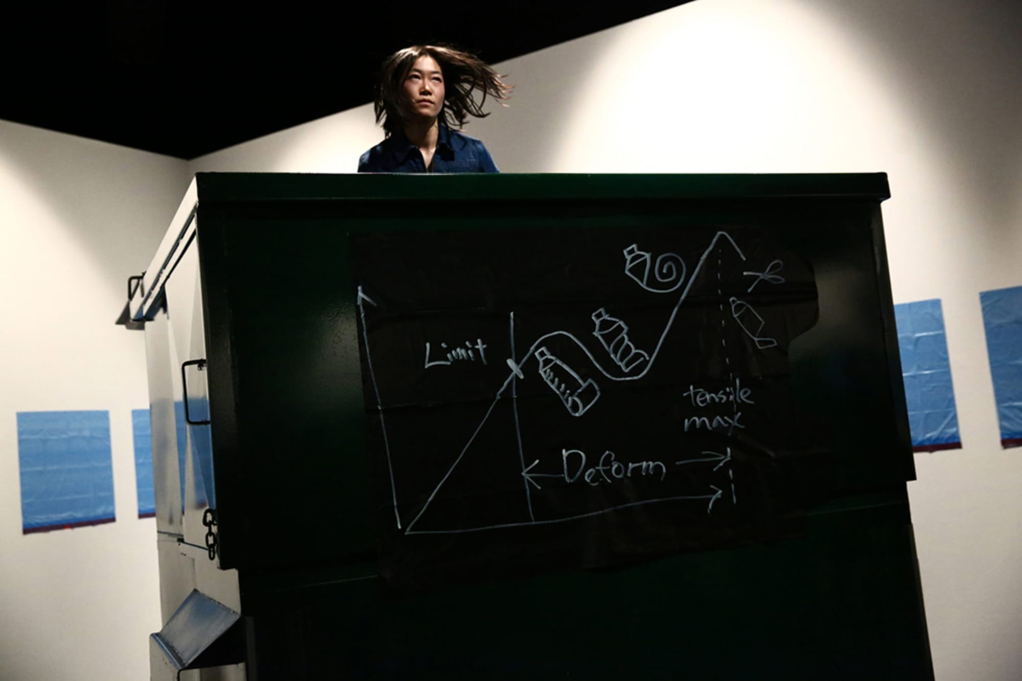 사사모토는 동명의 퍼포먼스 <Yield Point>에서 동일한 동작을 반복하며 항복점을 찾기 위해 자신을 끝까지 밀어붙입니다. 거대한 쓰레기통을 옮기고, 그 뒤 숨겨진 트램펄린에서 반복적으로 뛰는 행위를 통해 묻습니다. 우리는 실제로 얼마나 탄력적인가? 우리는 스스로를 어느 지점까지 통제할 수 있는가? 고통과 스트레스 속에서도 다시 일어설 수 있는 회복력이란 무엇인가?
