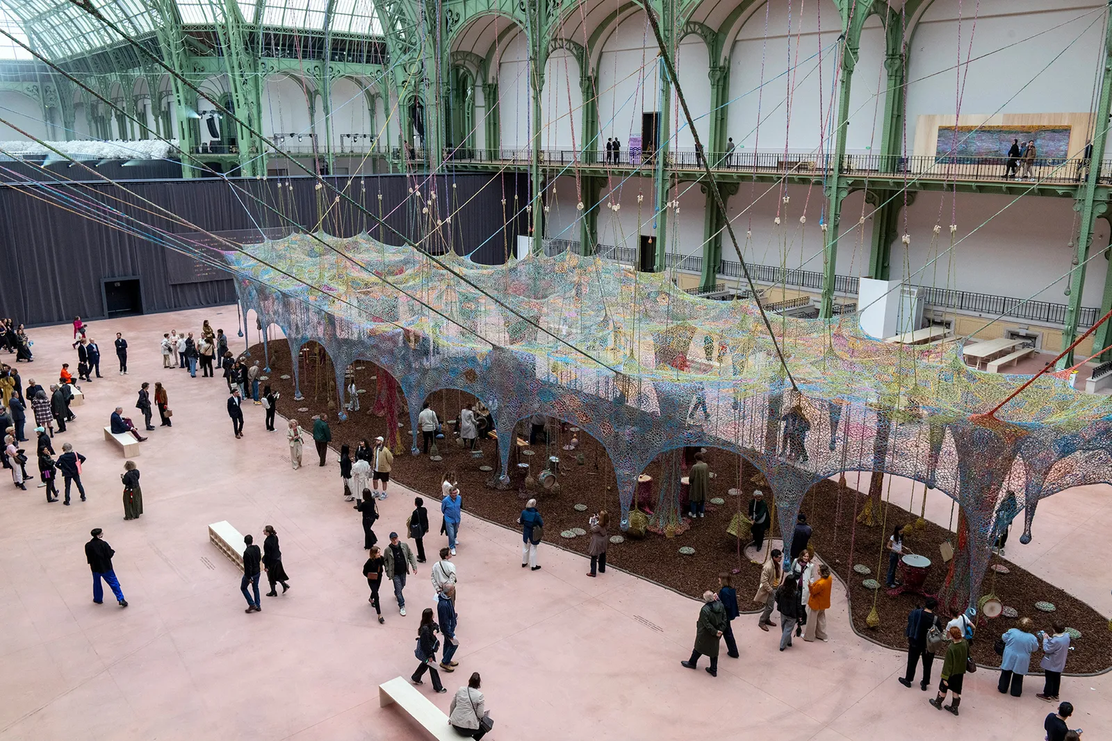 네토는 우리가 '자연'이라는 단어를 쓸 때마다 자기 스스로를 자연 바깥에 두는 경향이 있다고 말합니다. 그의 최근 작품인 'Nosso Barco Tambor Terra'은 그런 의미에서 우리가 언어적으로 혹은 물리적으로 그어놓은 자연과의 경계를 허무는 공간입니다. 미술관 홀 전체를 채운 이 직조 구조물에 가까이 다가가면, 그물망을 이루는 무수한 매듭과 실들이 눈에 들어옵니다. 마치 하나의 생태계와 같은 그 그물 안에 들어서면, 자연의 감각을 먼저 몸으로 느낄 수 있습니다.