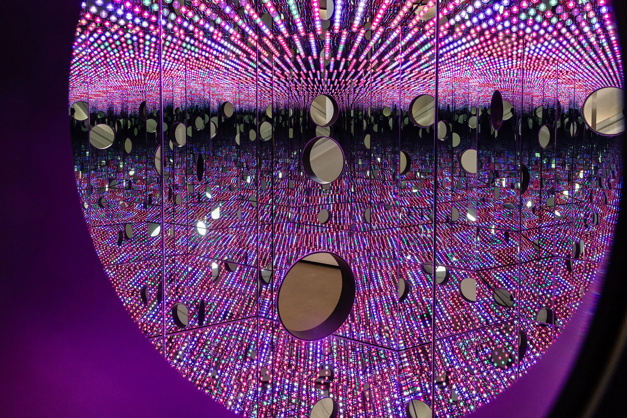 1965년 처음 선보인 이후 다양한 버전으로 제작되어 온 쿠사마 야오이(Yayoi Kusama)의 Infinity Mirror Room. 거울을 통해 LED 조명이 무한히 반사되는 공간에 들어서면, 끝없는 공간에 놓여 있는 듯한 느낌이 듭니다. 쿠사마는 어린 시절부터 겪어 온 환각을 통해 눈앞에 보이는 점과 패턴들을 캔버스에 옮겨 그리기 시작했습니다. 자신이 보고 그리는 그 무수히 많은 점으로부터, 그녀 역시 우주 속 하나의 점이라는 사실을 발견했습니다.
