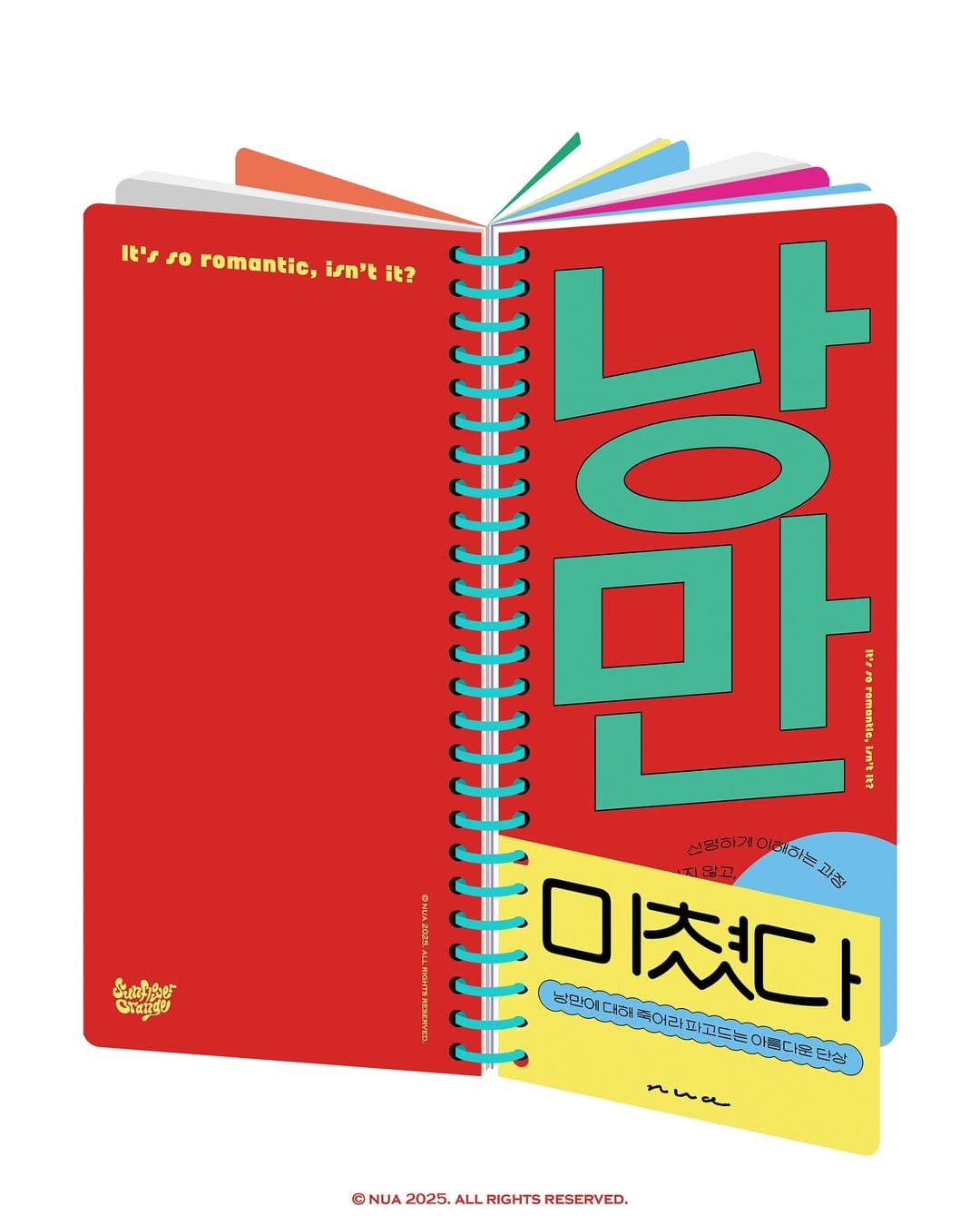 일러스트레이터 누아(NUA)는 알록달록한 파스텔톤 색감의 작품으로 밝고 경쾌한 에너지를 전달하는 작가입니다. 이번 퍼블리셔스 테이블에서 공개한 신간 <낭만 미쳤다>는 미술과 음악의 만남이라는 독특한 기획이 돋보입니다. 세로로 긴 판형에 단숨에 시선을 사로잡는 붉은 컬러의 표지, 통통 튀는 민트색 링제본에 반짝이는 유광 내지까지. 기성 출판에서는 볼 수 없는 자유로운 판형이 인상적이죠. 이번 신간에서 누아 작가는 글을 비롯해 그림과 사진으로, 뮤지션 서윤혁은 음악으로 참여했는데요. 책을 펼쳐 QR코드를 인식하면 책을 위해 작곡된 음악 세곡을 감상할 수 있습니다.