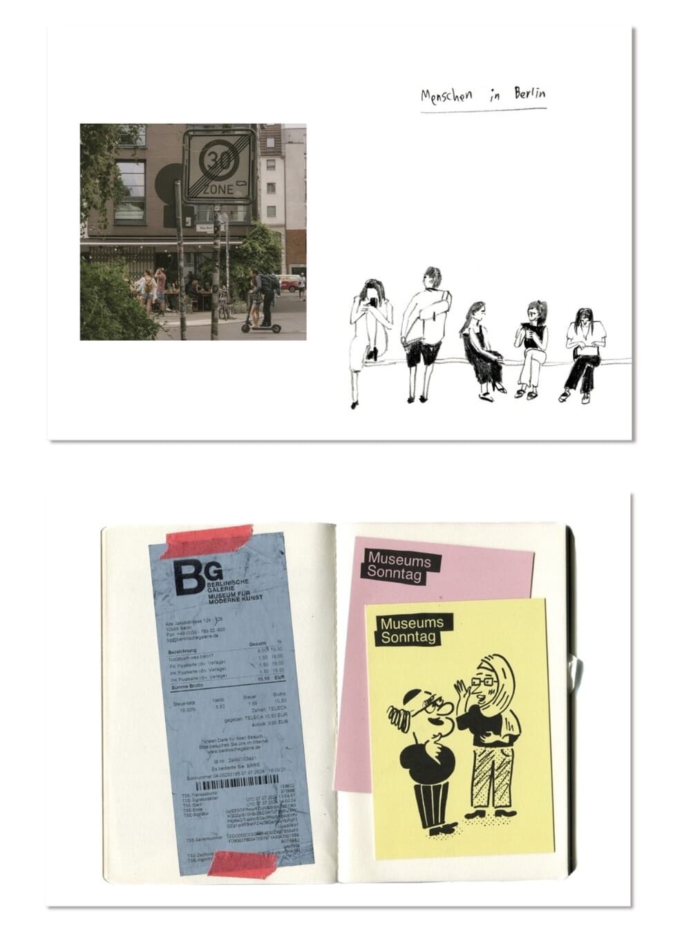 책 <The pieces of memory - Berlin>은 기억의 조각들이라는 이름처럼, 베를린에서 한 달간 채집한 풍경이 담겨 있습니다. 작업 노트를 스캔한 페이지부터 폴라로이드 사진, 연필 드로잉, 수채화, 엽서와 영수증 등이 수록되어 있어 왜 이 책이 사진집이나 드로잉북이 아닌 이미지북으로 소개되는지 알 수 있죠. 크라프트 재질의 표지에는 폴라로이드 사진이 붙여져 있고, 제목은 직접 붙인 마스킹테이프 위에 적혀있습니다. 책등을 노출하는 제본 방식은 빈티지한 매력을 살려주죠. 여행을 기억하고 기록하는 일러스트레이터의 방식을 엿볼 수 있는 영감으로 풍성한 책입니다.