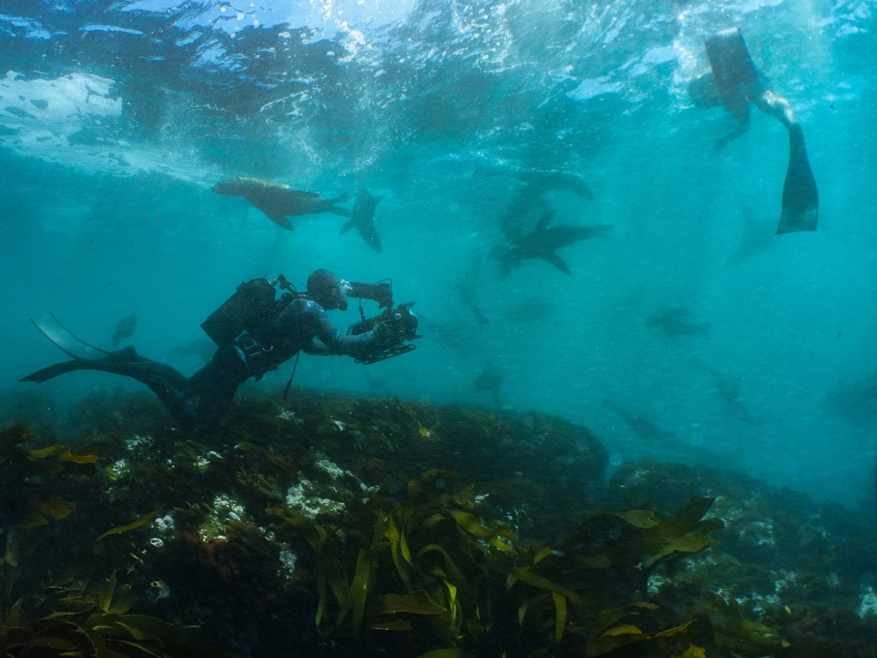 작품을 관통하는 인상적인 이미지 중 하나는 광활한 바다 위를 헤엄치는 크레이그의 아주 작은 뒷모습입니다. 이 장면은 인간이 생태계의 지배자가 아니라, 그 안에 머무는 수많은 존재 중 하나일 뿐이라는 사실을 시각적으로 보여줍니다. 거대한 자연 속에 위치한 작디작은 인간의 모습에 작품의 메시지가 압축적으로 담겨 있습니다. 그 풍경을 마주하며 인간이 지구 위에서 수많은 존재와 어떤 관계를 맺고 있는지 돌아보게 됩니다.