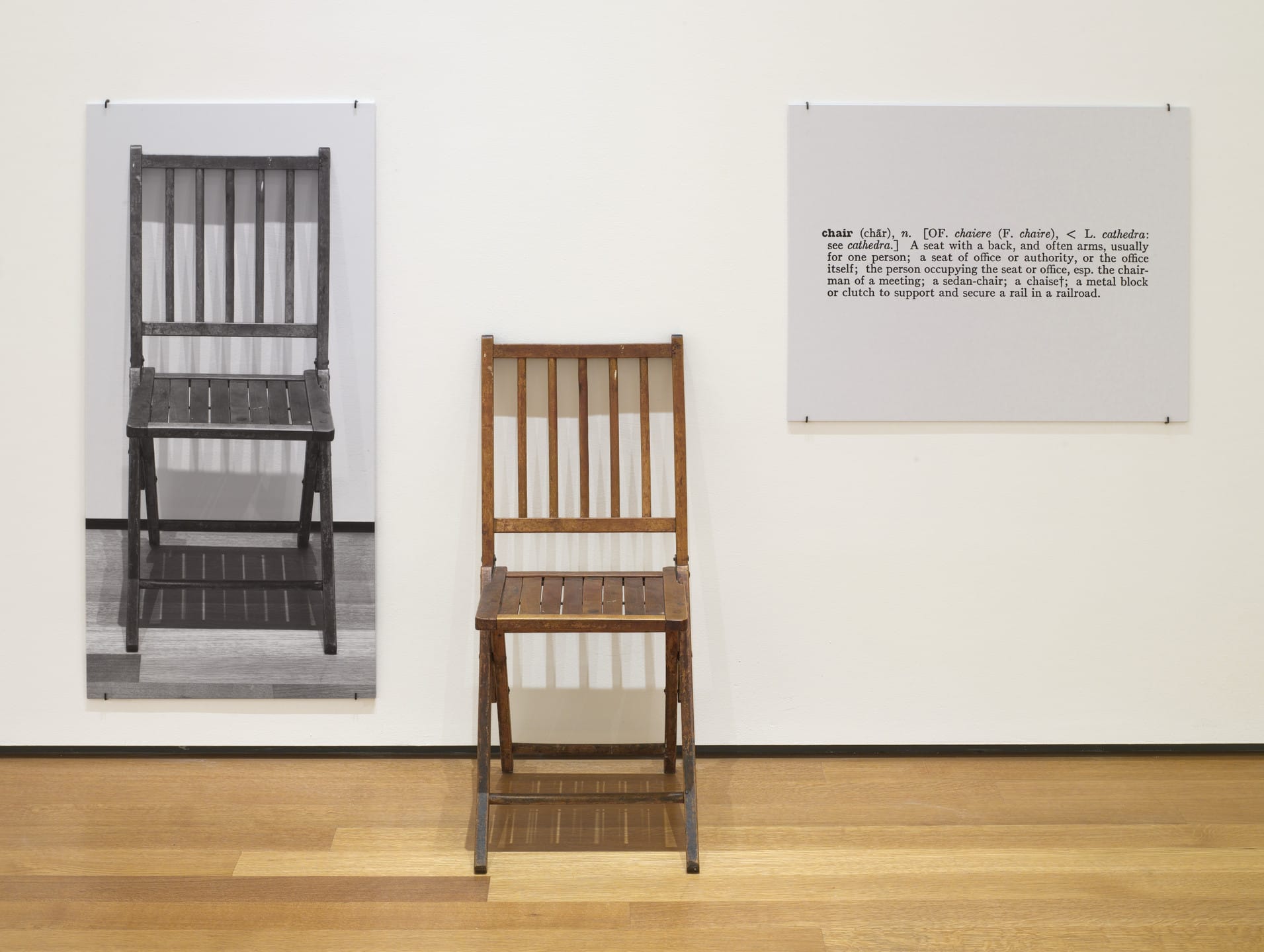 뒤샹의 ‘샘’이 뒤흔든 미술에 대한 전제에 대한 탐구과정을 지난하게 보여준 미술이 있다면 바로 개념미술일 것이다. 개념미술을 이야기할 때 빠지지 않고 등장하는 작업은 요셉 코수스(Joseph Kosuth)의 <하나이면서 셋인 의자(One and Three Chairs)>일 것이다. 가운데는 실물의 나무 의자가 놓여있고, 그 왼쪽에는 흑백의 의자 사진이, 그리고 오른쪽에는 의자의 사전적 정의가 제시되어있다. 이 중에서 어떤 것이 진정한 ‘의자’인 것일까?