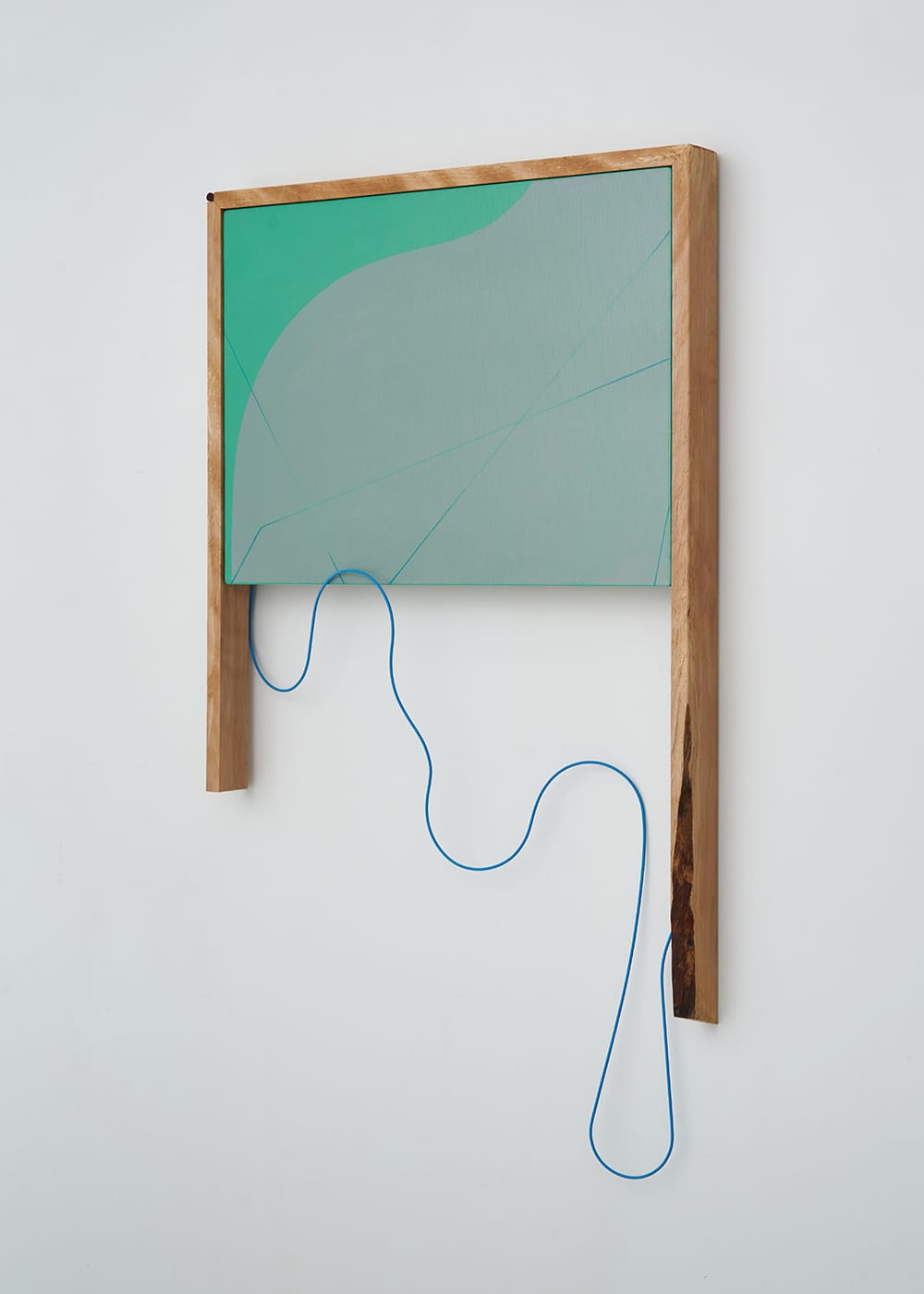 마침내 마주한 ‘잇은’의 작품에는 하나가 되기 위해 스스로를 지워낸 흔적이 전혀 보이지 않습니다. 캔버스의 천은 여전히 부드러운 질감을 유지하고, 금속 프레임은 차갑고 단단한 본연의 성질을 고수합니다. 물감은 그 위에 고요히 내려앉아 차분하게 침잠해 있지만, 나무 구조물은 더욱 확고히 도드라지며 자기만의 존재감을 드러냅니다.