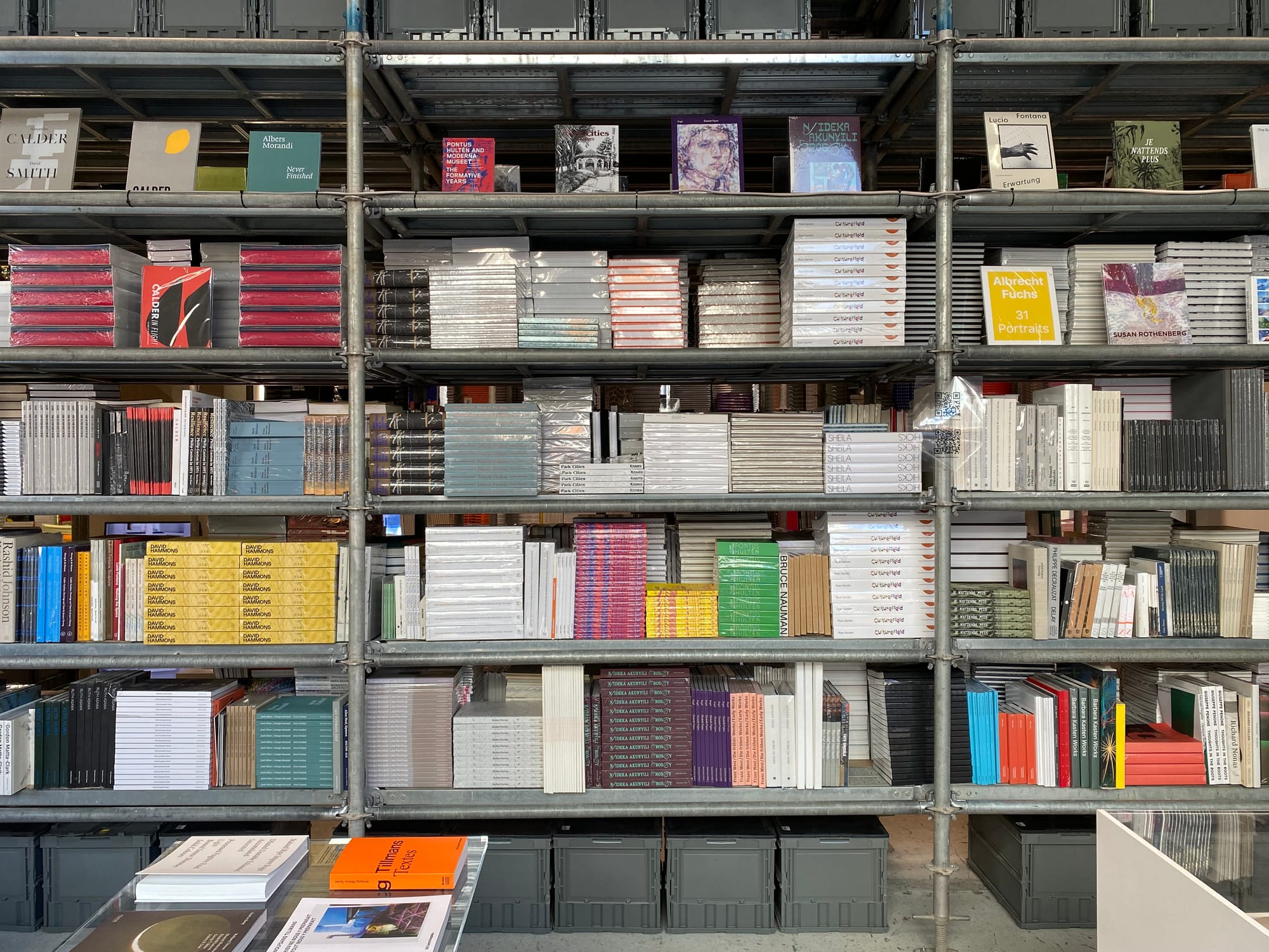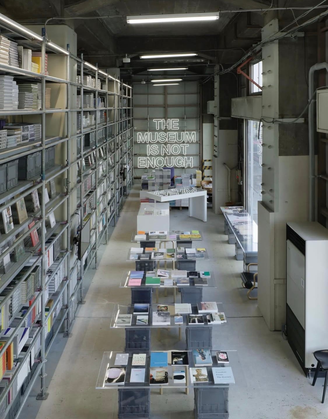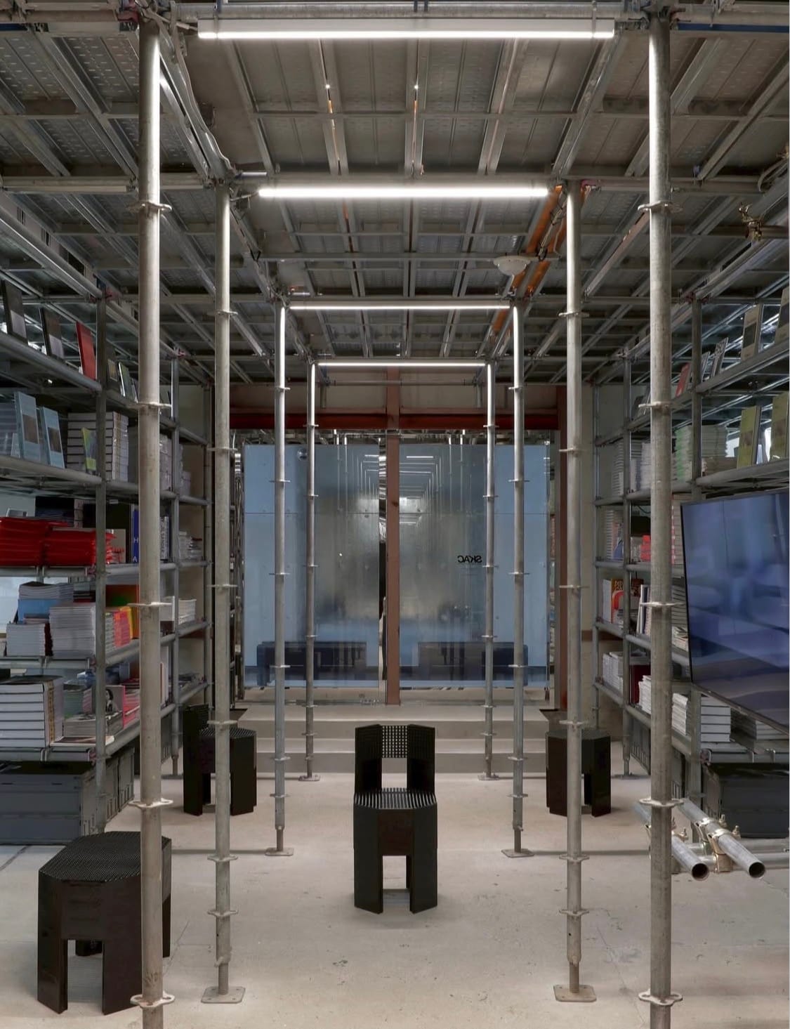 이 차가운 구조물을 생동감 있게 만드는 것은 그 사이사이를 밀도 있게 채운 수천 장의 종이와 오래된 LP들입니다. SKAC은 다양한 파트너들과 함께 공간의 콘텐츠를 만들어 나가는데, 그중 하나가 세계 각국의 아트북을 큐레이션하는 'twelvebooks'입니다. 덕분에 방문객들은 평소 접하기 힘든 희귀 예술 서적들 사이를 유영하며 자신만의 시간을 보냅니다.