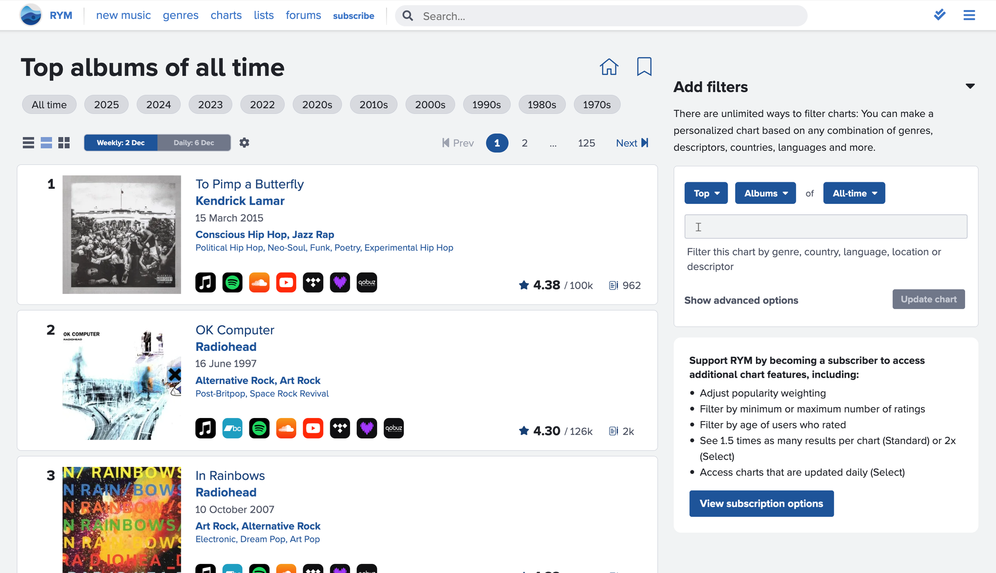 과거의 매거진은 오늘날 온라인 플랫폼과 커뮤니티로 대체되었습니다. 이제는 빌보드 차트만큼 스포티파이가 제공하는 차트와 플레이리스트가 큰 영향력을 지니죠. 롤링 스톤에서 좋은 평점을 받는 것보다는 RYM(Rate Your Music) 등 유력 커뮤니티 유저들의 선택을 받는 작품이 예상치 못한 좋은 결과를 만나기도 하고요. 하지만 대다수의 플랫폼은 큰 규모와 데이터라는 함정에 빠져 지극히 보편적인 리스트를 만들기도 합니다. 그 대표적인 사례가 2024년 공개된 애플뮤직의 ‘역사상 최고의 음반 100선’인데요. 훌륭한 큐레이션, 적극적인 음악가들과의 협업 등 음악에 ‘진심’인 애플뮤직의 리스트가 공개된다는 소식에 많은 사람이 주목했죠. 그러나 정작 공개된 리스트는 우리가 지금까지 수백 번은 더 봤을 만한 평범한 ‘명작선’에 가까웠습니다. 또, 매년 연말 각각의 플랫폼이 공개하는 ‘통계 기반’의 리스트는 한 해의 흐름을 데이터로 정리하는 데 그치곤 하고요.