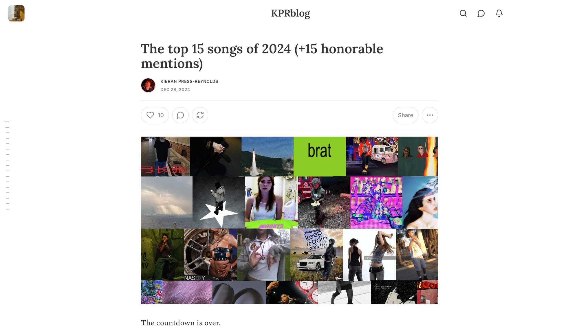 마지막으로 소개할 인물은 영국의 유명 음악 비평가 사이먼 레이놀즈(Simon Reynolds)의 아들 키어런-프레스 레이놀즈(Kieran-Press Reynolds)입니다. 이들 부자는 가업을 잇는 양 나란히 음악 비평 활동을 하고 있는데요. 아버지 레이놀즈가 독특한 시각으로 1990년대 영국과 미국의 음악을 진단했듯, 아들 레이놀즈 역시 오늘날 음악 시장의 경향을 아주 신선한 관점으로 바라봅니다. 그리고 그가 공개한 ‘2024년 최고의 노래’ 리스트를 보고 저는 경탄을 금치 못했는데요. 여느 매거진과 커뮤니티에서도 마주한 적 없는 아티스트와 작품의 존재는 둘째치고, 그의 리스트를 가득 채운 1분짜리 사운드 클라우드 음악들의 존재 때문이죠. 이는 키어런이 주요하게 포착하는 현재의 음악 경향, 곧 ‘인터넷’을 기반으로 상호작용하는 음악가와 작품의 중요성을 반증하는데요. 리스트와 함께 음악을 감상한 뒤, 저는 이들이 한 해를 대표할만큼 ‘가장 훌륭한 음악’이라고 말은 못 할지언정, 키어런의 관점을 고려했을 때 이들이 한 해를 설명하기에 ‘가장 적절한 음악’이라고 말할 수는 있으리라 생각했습니다.