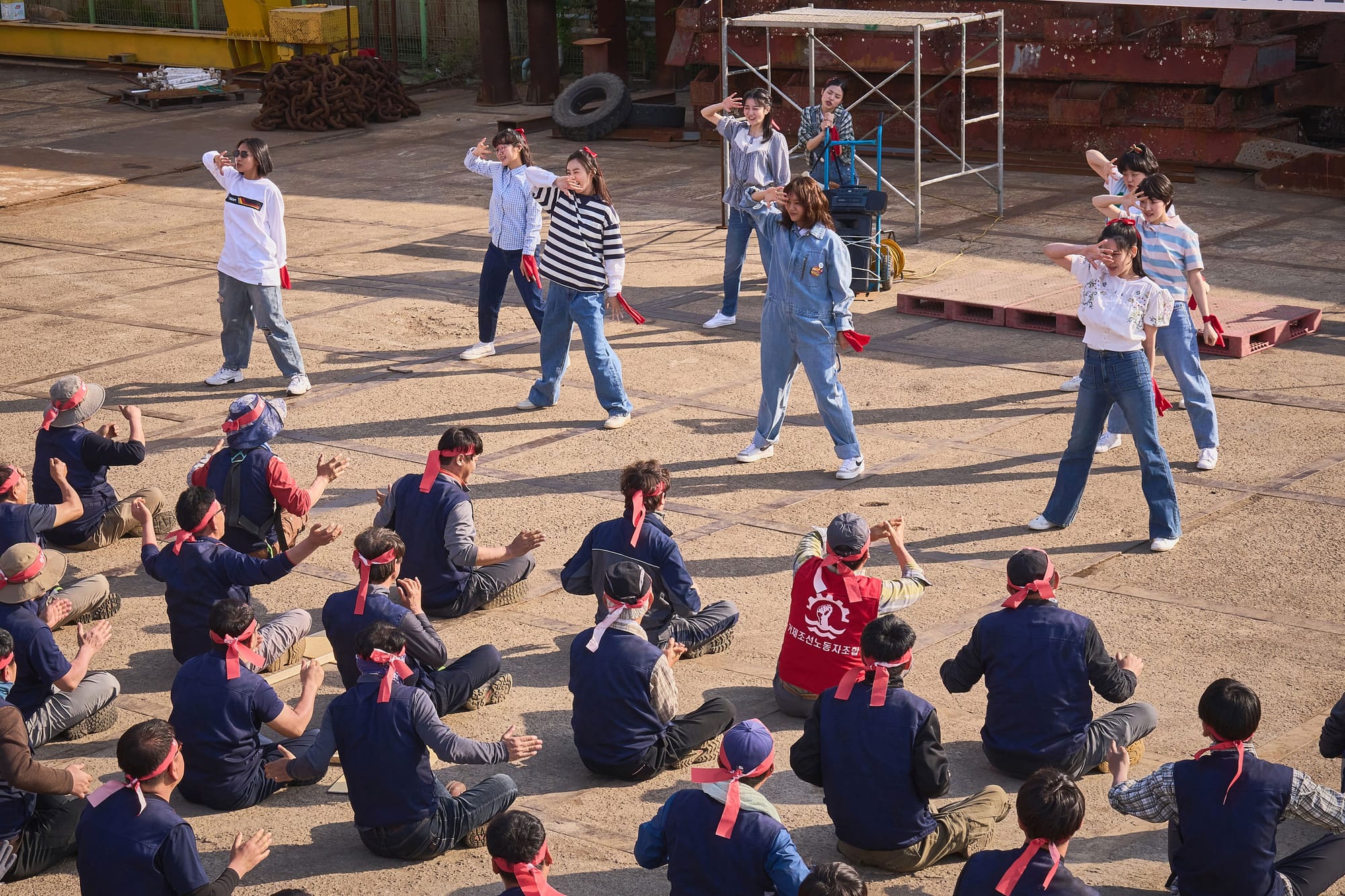 하지만 영화는 이들을 들러리로 바라보지 않는다. 오히려 '응원의 주체성'에 주목하는데, 이런 관점은 특히 영화 중반부에 잘 드러난다. 호흡이 맞지 않아 실패로 끝난 첫 번째 치어리딩 공연 이후, 밀레니엄 걸즈는 실전 경험을 쌓기 위해 응원이 필요한 곳이라면 어디든 직접 찾아다닌다. 아무도 시키지 않았는데도 시장에서, 병원에서, 파업 현장에서 팔과 다리를 쭉쭉 펴가며 힘차게 응원한다.