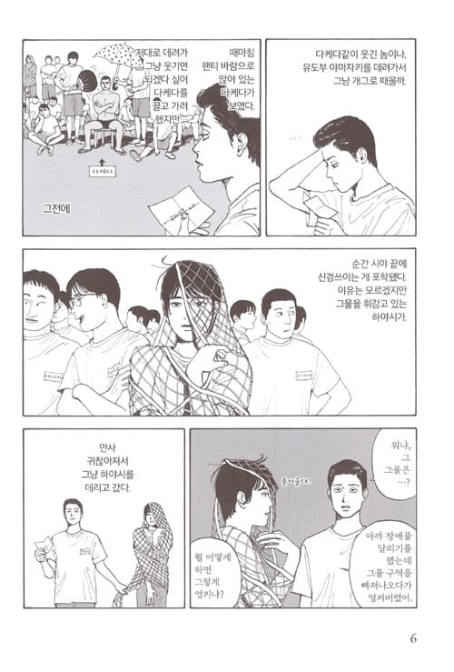 작가는 두 번째 작품 『가라오케 가자!』에서 전혀 다른 배경으로 이동하지만, 인물을 바라보는 시선만큼은 변하지 않습니다. 조직 내 가라오케 대회에서 벌칙을 피하고 싶은 야쿠자 나리타가 합창부원인 중학교 3학년 남학생 오카에게 노래 잘하는 법을 배우면서 이야기는 시작합니다.